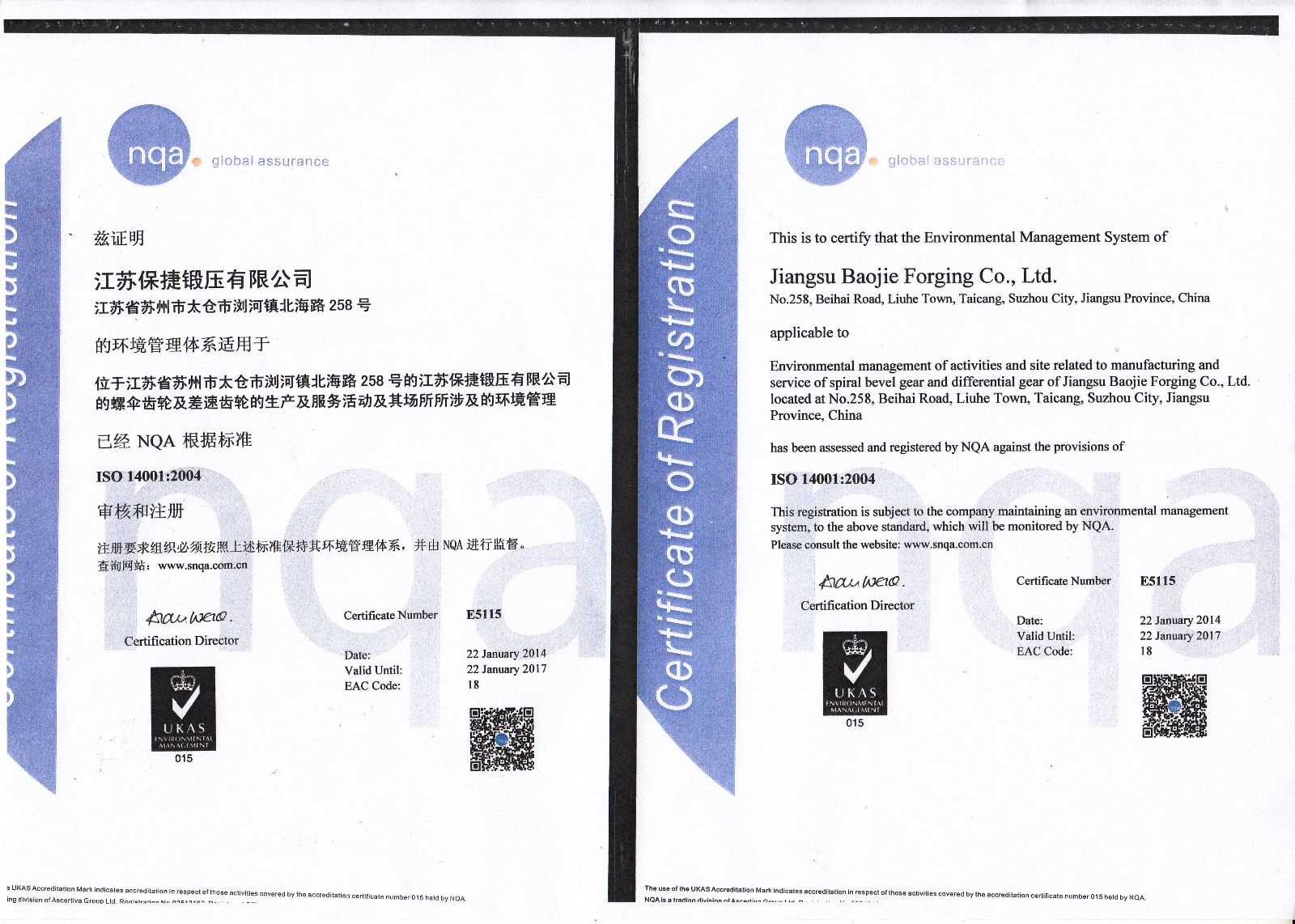 ISO1400環(huán)境體系證書(shū)