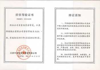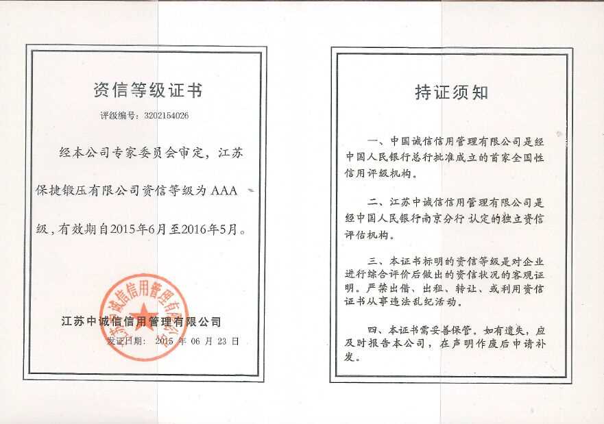 江蘇保捷鍛壓有限公司資信等級(jí)為AAA級(jí)